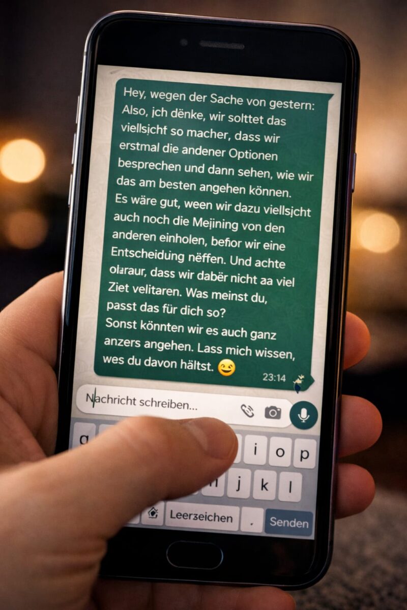 Es ist eine Szene, die heute völlig normal wirkt. Zwei Menschen haben ein Thema zu klären. Früher hätte einer von beiden zum Telefon gegriffen, die Nummer gewählt und das Gespräch wäre innerhalb weniger Minuten erledigt gewesen. Heute öffnet man stattdessen WhatsApp, tippt eine Nachricht, löscht sie wieder, formuliert neu, schickt sie ab und wartet. Oft entsteht daraus kein kurzer Austausch, sondern ein Nachrichtenverlauf, der sich über Stunden oder sogar Tage zieht.